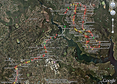 Green dots are open networks, yellow are WEP and red are WPA2. I love some of the names, there's lots of Netgear and linksys but a few funny ones like "baby killer".